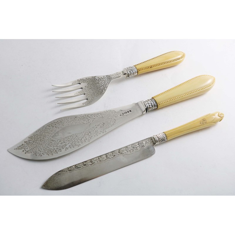 with ivory Bead pattern handles, the knife with a fish on one side and the dedication "E.Mac G. Auld", by Henry Wilkinson & Co., Sheffield 1874 and a Victorian engraved cake knife with an ivory handle, initialled, by George Unite, Birmingham 1872; the latter 10.55" (27 cms) long (3)