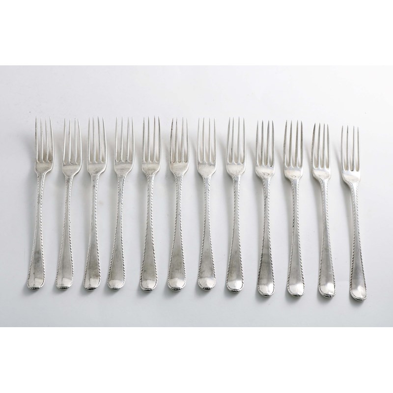 A SET OF TWELVE GEORGE III DESSERT FORKS Feather-edge pattern, crested, by John Lambe, London 1774; 16.1 oz (12)
