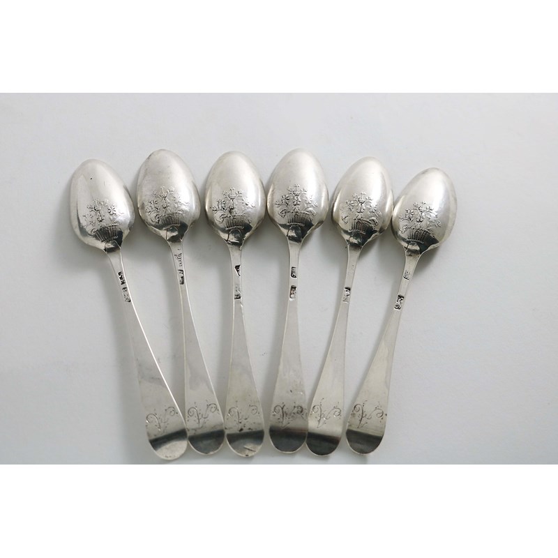 Hanoverian pattern, with a basket of flowers below the drop, initialled, "A", by Thomas & William Chawner, London c.1765 (maker's mark & lion passant only); 2.95 oz (6)