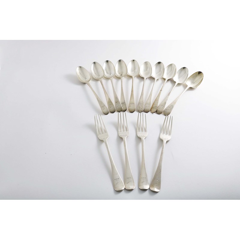 A MATCHED SET OF TEN GEORGE III OLD ENGLISH PATTERN DESSERT SPOONS crested, by various makers, mixed dates, London 1766/1776/1777 and four various antique dessert forks, also crested to match; 15 oz (14)