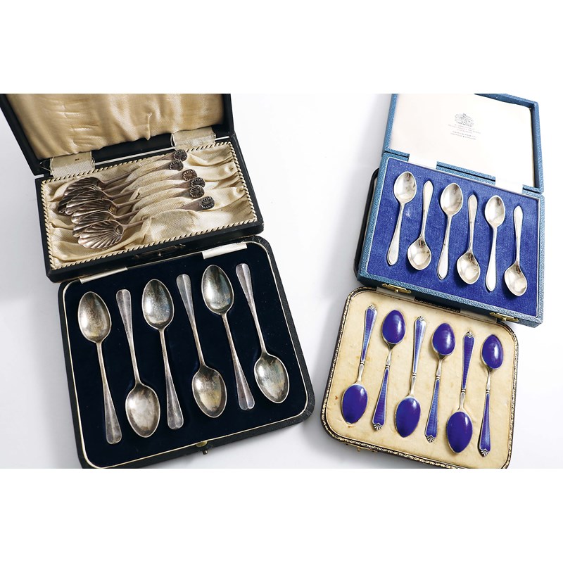AN EARLY 20TH CENTURY CASED SET OF SIX SILVERGILT AND BLUE ENAMELLED COFFEE SPOONS by Walker & Hall, Birmingham 1929 and three other cased sets of six tea/coffee spoons; 9 oz (4)