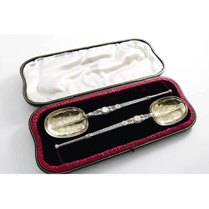 AN EDWARDIAN CASED PAIR OF LARGE PARCELGILT "CORONATION" SPOONS by J. Wakely & F.C. Wheeler, London 1901; 10.25" (26 cms) long; 5.9 oz