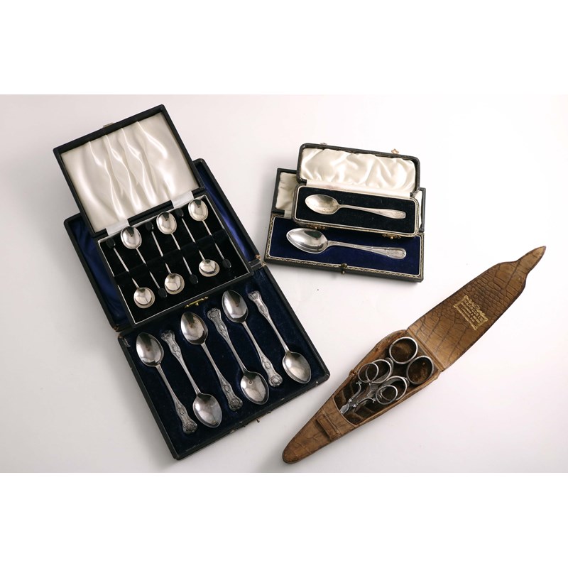 A set of six King's pattern tea spoons, cased, a set of six bean-end coffee spoons, cased, a tea spoon with initials & date, cased, and a late Victorian cased set of three graduated pairs of steel sewing scissors (retailed by Harrods); the latter case 7.25" (18.5 cms) long; 4.1 oz weighable silver (5)