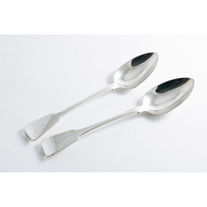 A PAIR OF GEORGE III WEST COUNTRY FIDDLE PATTERN TABLE SPOONS by George Ferris of Exeter, 1818; 5.7 oz (2)
