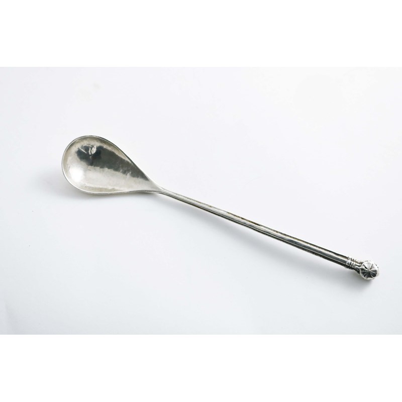 with a long, tapering stem of cruciform section, a drop-shaped bowl and a knop finish with a clover or shamrock on the front & back, by Omar Ramsden, London 1936; 7.5" (19 cms) long; 1.45 oz
