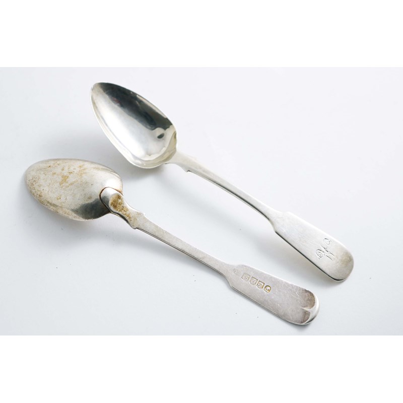 A PAIR OF EARLY VICTORIAN SCOTTISH PROVINCIAL FIDDLE PATTERN TEA SPOONS initialled "M", by Adam Burgess of Castle Douglas/Dumfries (AB, castle, thistle, D, tree), 1840-45; 1.1 oz (2)