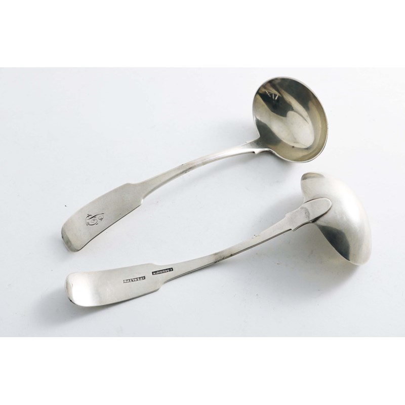 A PAIR OF GEORGE III IRISH PROVINCIAL FIDDLE PATTERN SAUCE LADLES initialled "P", by Isaac Solomon of Cork (I.SOLOMON, STERLING) 1820-30; 3.8 oz (2)