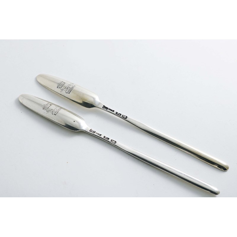 each engraved with a crest below a Viscount's coronet, maker's mark "T.D", possibly by Thomas Dene, London 1767; 8.5" (21.6 cms) long; 2.8 oz (2)