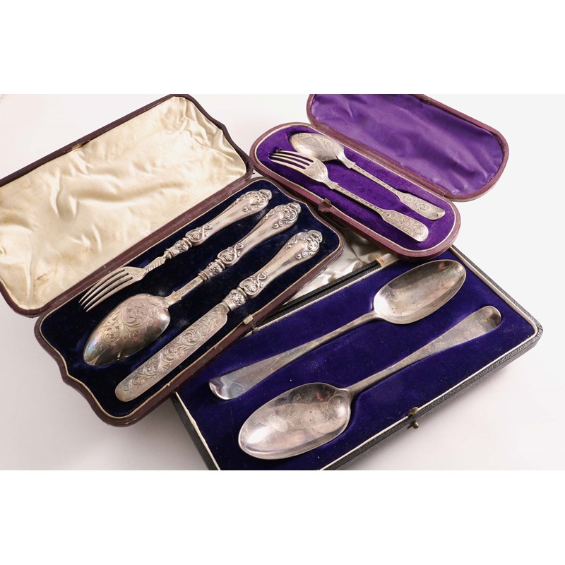A Victorian engraved Christening knife, fork & spoon with ornate handles (loaded), maker's mark "B&C", Birmingham 1855, a pair of George III table spoons, and an engraved Fiddle dessert spoon & fork by Messrs. Lias, London 1869; 4 oz weighable silver (3)