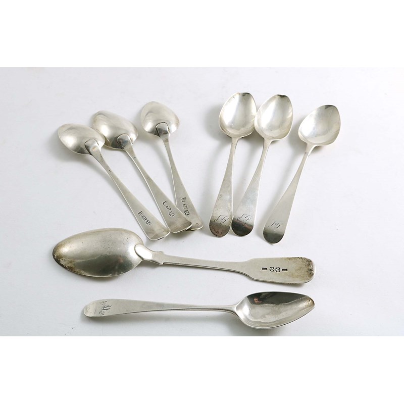 A set of six George III tea spoons, initialled "GS", by John Keith of Banff, 1800-1810, a rare Fiddle & Thread tea spoon, crested and initialled, by Robert Robertson of Cupar 1830-40 and a London-made tea spoon; 3.95 oz (8)