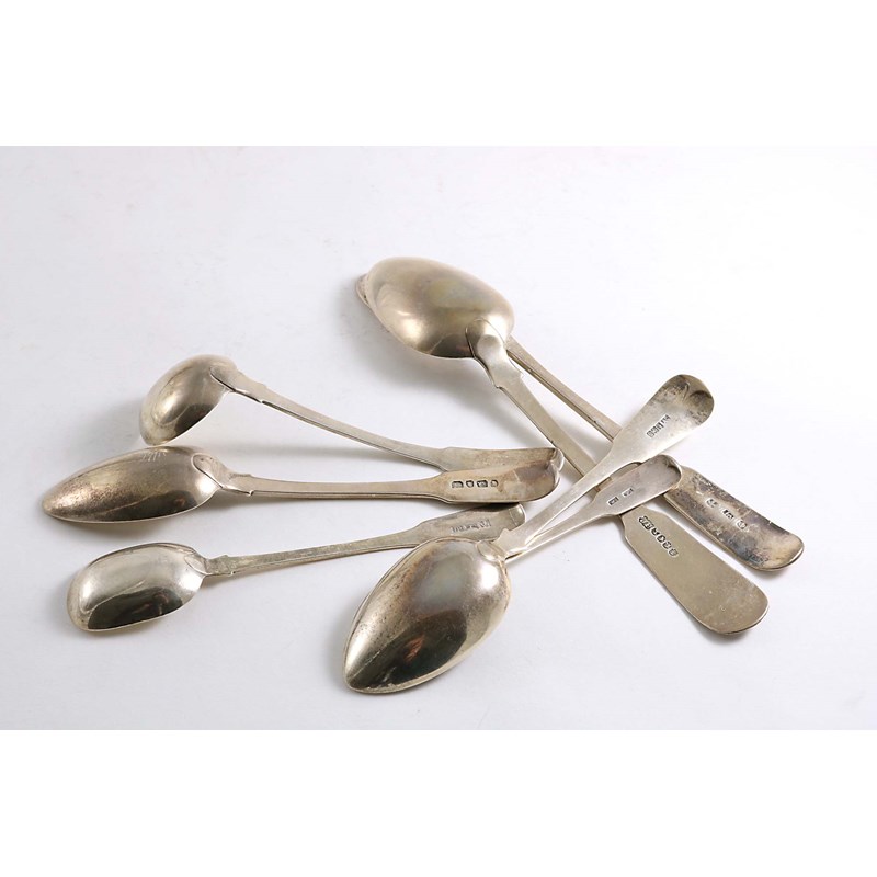 A Fiddle sugar spoon, initialled "H", by Joseph Pozzi of Elgin c.1830, a Fiddle tea spoon, initialled, by William Simpson of Banff, a Fiddle dessert spoon, initialled "MD" by Alexander Cameron of Dundee, a Fiddle toddy ladle, crested, by an unascribed Dundee maker, two unascribed table spoons and a Chinese dessert spoon with pseudo marks; 9.5 oz (7)