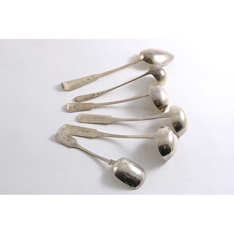 A small quantity of Aberdeen-made flatware including a table spoon and two toddy ladles, by James Erskine, a sugar spoon by William Whitecross and a pair of toddy ladles by Peter Ross, each piece either crested or initialled; 6.35 oz (6)