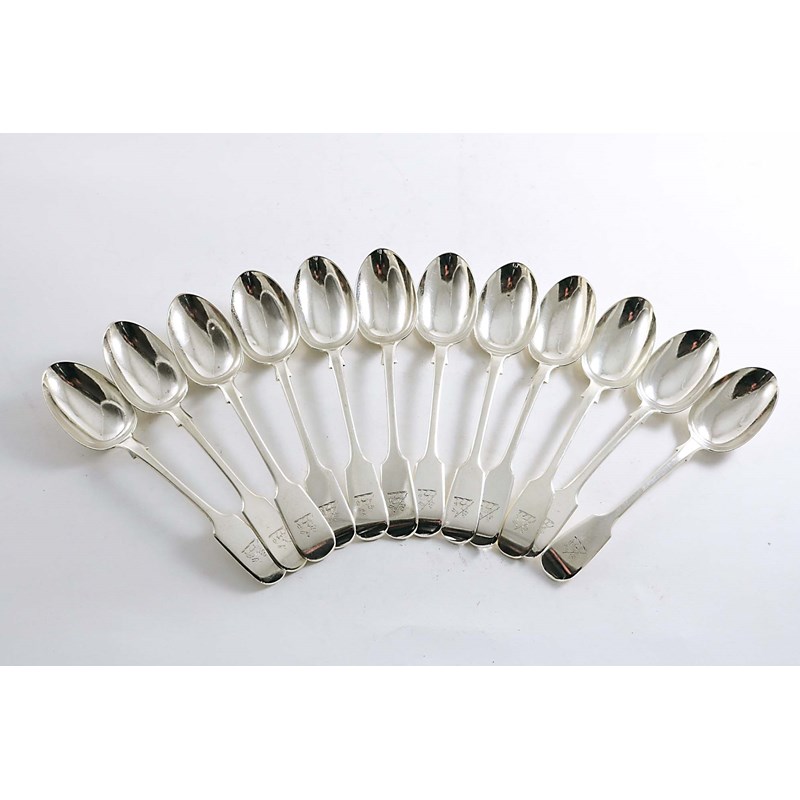 A SET OF TWELVE VICTORIAN DESSERT SPOONS Fiddle pattern, engraved with the crest of the Middle Temple, by George Adams, London 1869; 17.5 oz (12)