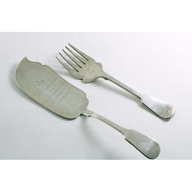 Fiddle pattern, engraved with the crest of the middle Temple and inscribed "M.T.AD.ANTIQUORUM.USUM.D.D CAROLUS.WAGER.RYALLS L.L.D.SOCIUS MDCCCXCIX" by H. Atkin, Sheffield 1899, and a fish serving fork, Fiddle pattern, also engraved with the crest of the Middle Temple and similarly inscribed, but to "JOHANNES EDWINUS MITCHELL MILES A.D.MCMXXX", by C. Boyton & Sons, Sheffield 1930; the slice 9.75" (24.5 cms) long; 15.95 oz (2)