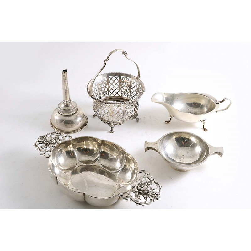 A George III wine funnel by Robert & David Hennell, London 1799, a sauce boat, a small quaich, a Continental brandy bowl with a lobed oval body and English import marks for London 1910, and a swing-handled sugar basket (lacking glass liner); the latter 3.25" (8.2 cms) high; 19.9 oz (5)