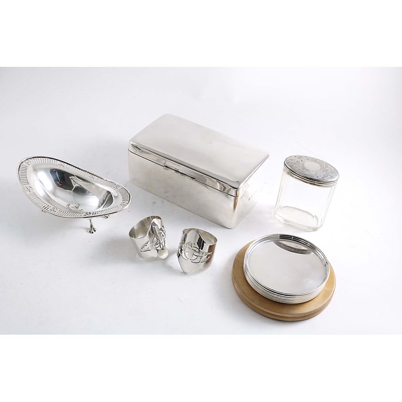 A cigarette box (cedarwood lining) by A & J. Zimmerman, Birmingham 1899, a pair of pierced napkin rings, a late Victorian mounted glass toilet jar, a boat-shaped bonbon dish with a stamped crest & motto in the centre, and a nest of seven plain circular coasters on a wooden stand; the latter 3.8" (9.7 cms) diameter; 17 oz weighable silver (12)