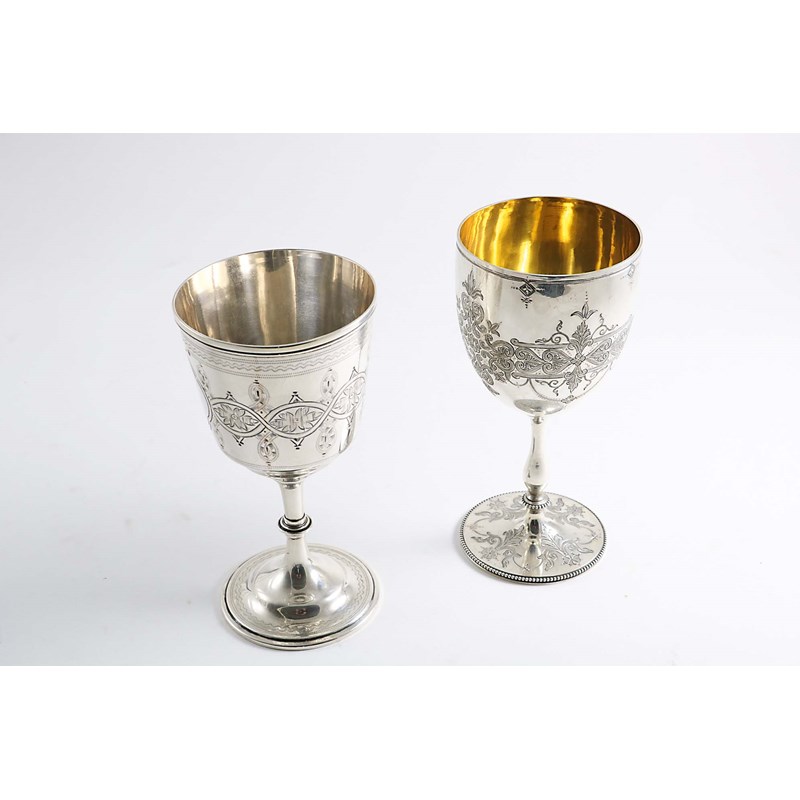 with a beaded pedestal base & a gilt interior, by Edward Ker Reid, London 1871 and another Victorian engraved goblet, maker's mark worn, Birmingham 1868; the latter 6" (15.1 cms) high; 10.4 oz (2)