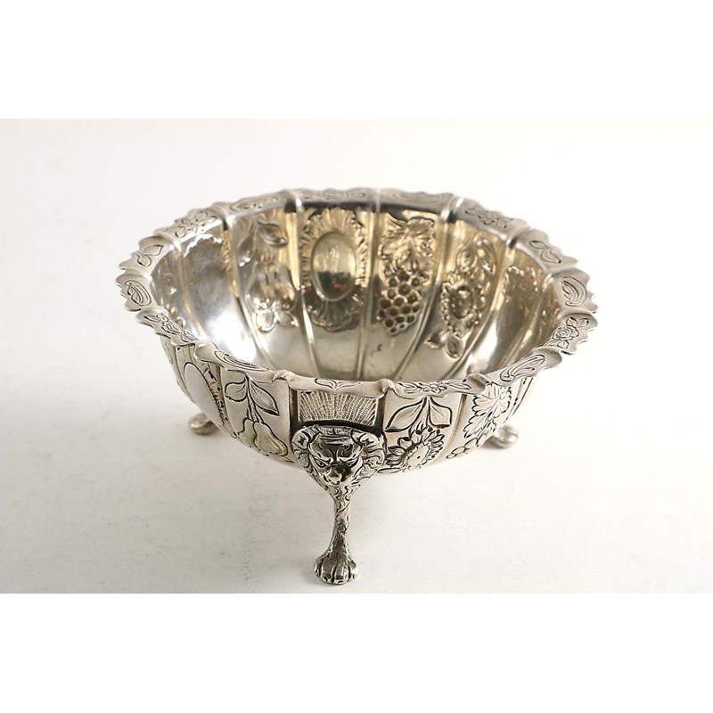 on three cast lion mask and feet, the shaped cut rim chased with flowers, leaves & scrolls, the sides with flowers, fruit and three vacant cartouches, the base with the scratchweight "6-12", unmarked 1755-65; 56.4" (13.7 cms) diameter; 6.4 oz
