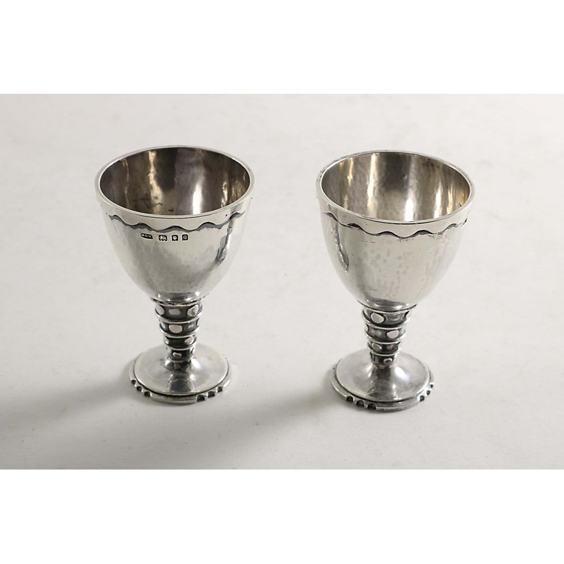 on notched circular pedestal bases with applied pellets and rings, the bowls with applied wavy rims, by H.G. Murphy, London 1931; 2.75" (7 cms) high; 3.35 oz (2)