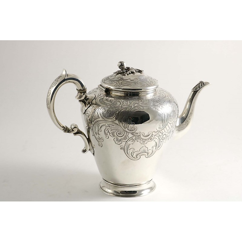 with a tapering body, a c-scroll handle and a fruit finial, engraved on the upper body & cover with flowers, husks & scrolls, vacant cartouche, by John Evans, London 1844; 7.75" (19.8 cms) high; 24.2 oz