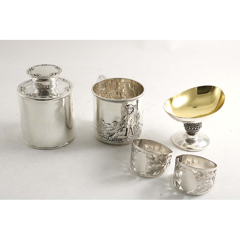 with a pull-off cover and stamped borders of tied ribbons & festoons, by R. Martin & E. Hall, Birmingham 1910, a pair of Edwardian napkin rings, pierced & engraved with thistles, vacant cartouches, Birmingham 1908, a pedestal salt with a gilt bowl interior, by Adie Bros., Birmingham 1962 and a child's mug stamped with a little girl; the mug 2.95" (7.3 cms) high; 14 oz (5)