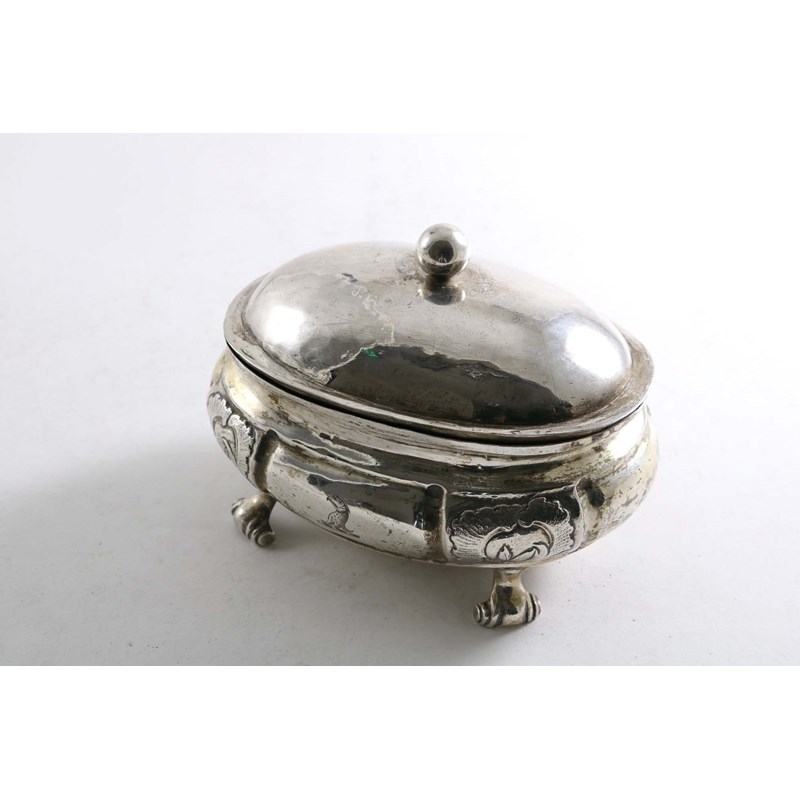 AN 18TH CENTURY RUSSIAN OVAL SUGAR BOX on four scroll feet with a domed cover & ball finial, crested, probably by Vasily Kunkin, Moscow 1750-70 (date mark not visible); 5.5" (14 cms) long; 7.3 oz