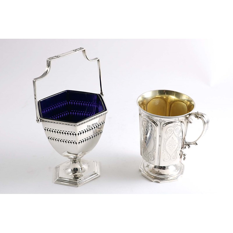 with a hexagonal body & foot (blue glass liner), by Joseph Rogers, Sheffield 1910 and a Victorian engraved Christening mug, gilt interior & two vacant cartouches, by Richard Pearce, London 1857; the latter 4.75" (12 cms) high; 11.95 oz weighable silver (2)
