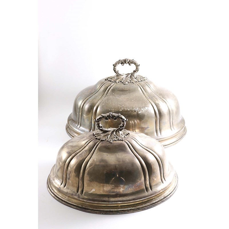 A GRADUATED PAIR OF LATE PERIOD OLD SHEFFIELD PLATED MEAT DISH COVERS with detachable, foliate scroll handles, crested; the larger one 17.8" (45.3 cms) long (2)