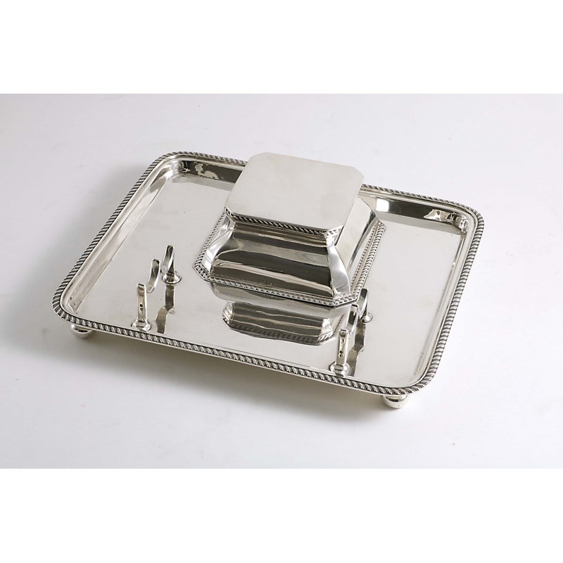 AN EARLY 20TH CENTURY RECTANGULAR INKSTAND with gadrooned borders, a pen rest and a bevelled square receiver with hinged cover & glass liner, by Hukin & Heath, Birmingham 1920; 8.55" (22 cms) long; 16 oz