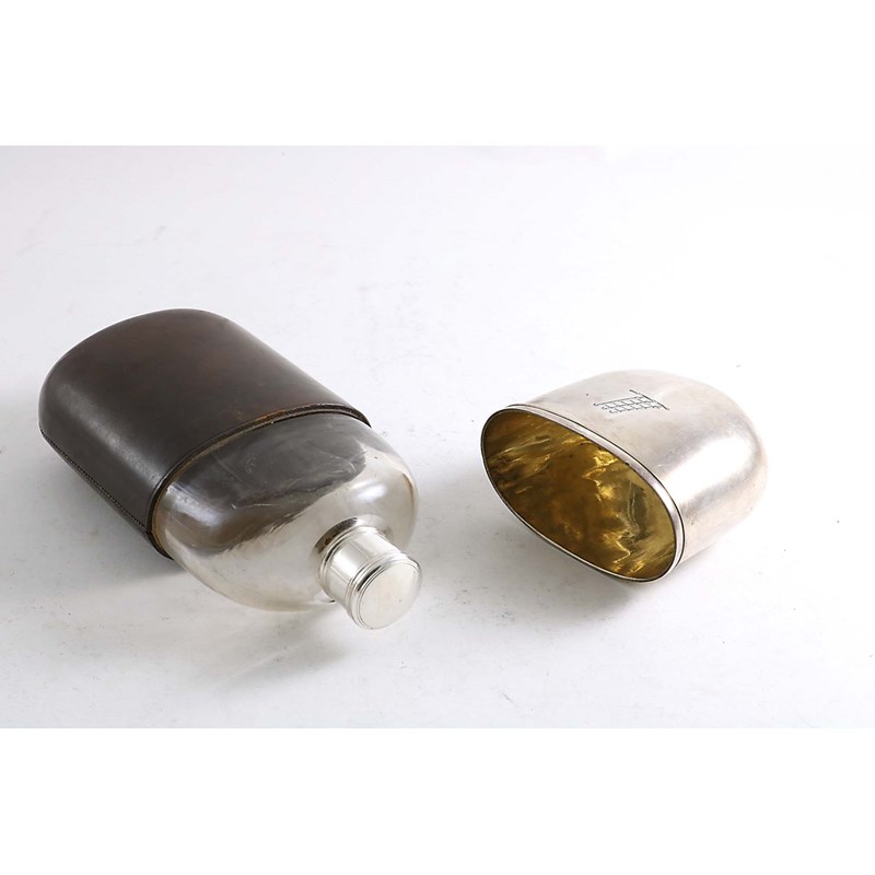 of rounded oblong form with a leather-clad upper body, a pull-off cup, crested, and a screw cap, by C. Rawlings & W. Summers, London 1848; 7.5" (19 cms) long; 3 oz weighable silver