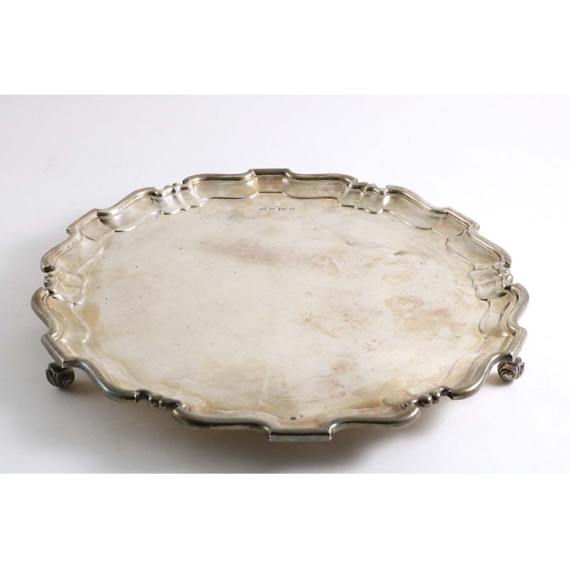 A MID 20TH CENTURY SALVER of shaped circular outline with a moulded border and scroll feet, by the Alexander Clarke Manufacturing Co.Ltd., Sheffield 1957; 12.3" (31.4 cms) diameter; 28.8 oz