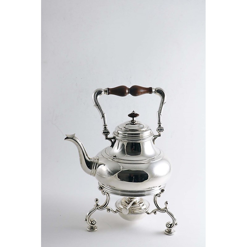 with burner, resembling a George I example, with a mounted wooden swing handle and three scroll legs, and a square circular body, by Wakely & Wheeler, Dublin 1920; 12.75" (32.5 cms) high; 54.45 oz