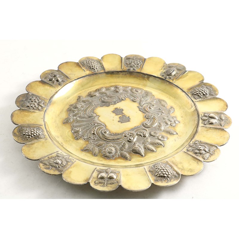 A SILVERGILT DECORATIVE DESSERT PLATE engraved crest & Earl's coronet (altered from an 18th century dinner plate), remains of original marks on the reverse; 9.8" (25 cms) diameter; 15.4 oz