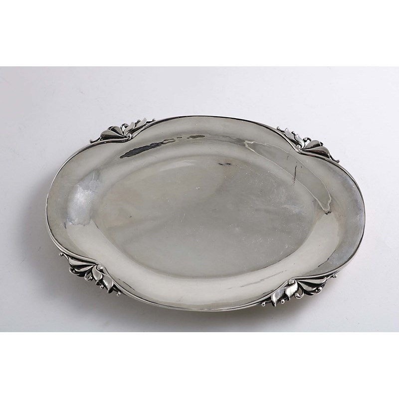 of shaped oval outline with four stylised flowerhead clusters around the border and a small inscription on the foot, by Georg Jensen, Copenhagen 1925-1932 (Incuse pattern No. 393A); 8" (20.5 cms) long; 8 oz