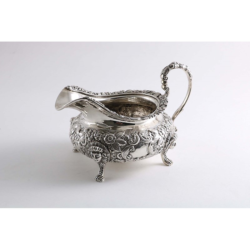 A WILLIAM IV IRISH EMBOSSED CREAM JUG of squat circular form with mask & paw feet and two vacant cartouches, by Smith & Gamble, Dublin 1831; 4.4" (11 cms) high; 13.5 oz