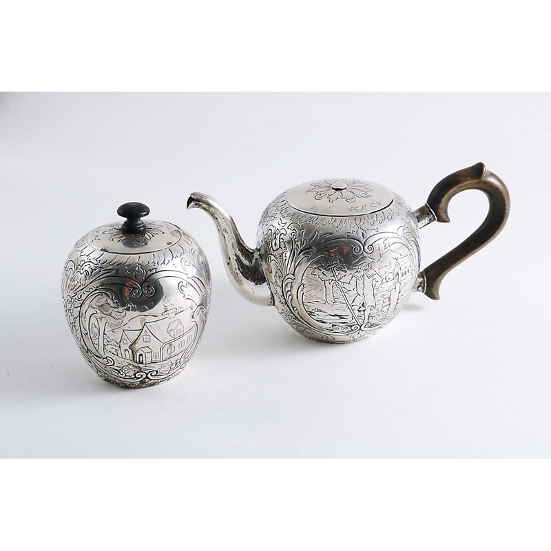 A LATE 19TH CENTURY DANISH SMALL BULLET TEA POT & MATCHING TEA CADDY with chased decoration, each with a tranquil country scene on one side and a figure with a staff on the other, each initialled "JNS" and dated "1774" on the cover, and each struck with pseudo marks for the Assay Master 'Danish Conrad Ludolph (twice) and also a zodiac mark (once), unascribed 1870-1890; the caddy 3.5" (9 cms) long; 11.3 oz (2)