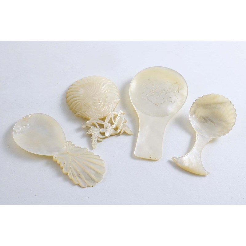 A George III large plain example, initialled "TCR" in the bowl, a George III small example with a shell bowl and "Onslow" terminal, a 19th century pierced & engraved example with a shell bowl and another 19th century example; the largest one 3.5" (9 cms) long (4)