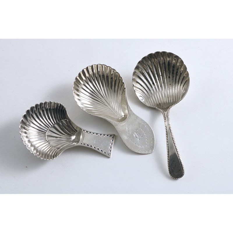 Three George III caddy spoons with fluted shell bowls to include a Bead pattern example, initialled "B", by Richard Morton & Co. 1789, another with an initialled handle, "H", by Samuel Roberts, Cadman & Co., 1794 and another with an engraved, squared-off stem, initialled "ST" on the reverse, maker's mark indistinct, 1784; the longest one 3.4" (8.5 cms) long; 0.95 oz (3)