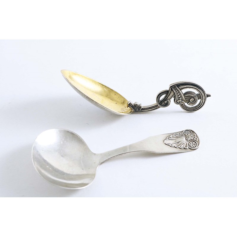 An early 20th century Norwegian caddy spoon with a stylised dragon handle & a gilt bowl, maker's mark partially unclear, possibly by Theodor Olsens of Bergen c.1910, and a Swedish spoon with a decorative leaf terminal by Niklaus Andersson of Kristianstad 1810-43; the latter 4" (10 cms) long; 1.1 oz (2)