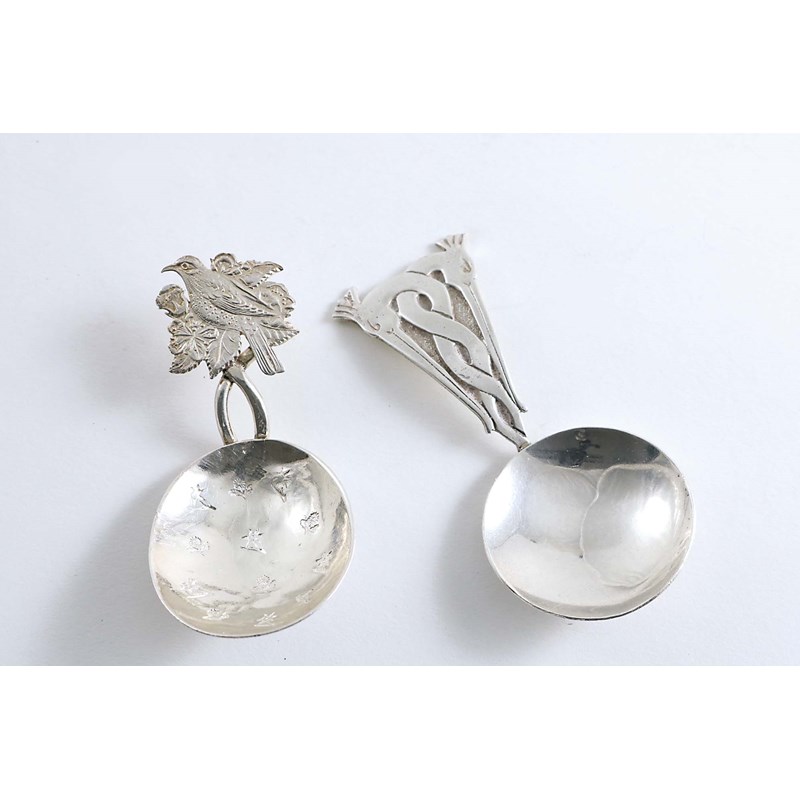 with two entwined bird's heads & necks in low relief up the stem, marked only "SILVER", possibly made on Iona 1940-1960 and a late 20th century caddy spoon with a bird on its nest as the terminal and stamped flowrs in the bowl, by John H. Fenn, London 1972; the latter 3" (7.5 cms) long; 1.2 oz (2)