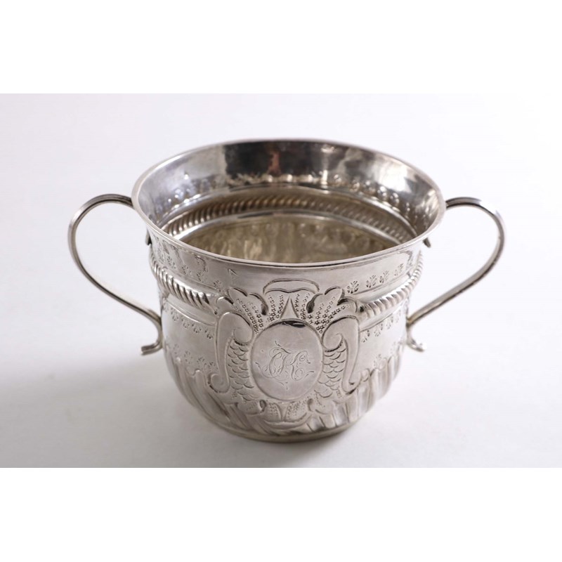 with embossed swirl fluting around the lower body, a rope-work girdle and a chased cartouche, initialled, the base with a small later inscription, by Nathaniel Lock, London 1706; 2.65" (7.5 cms) high; 2.9 oz