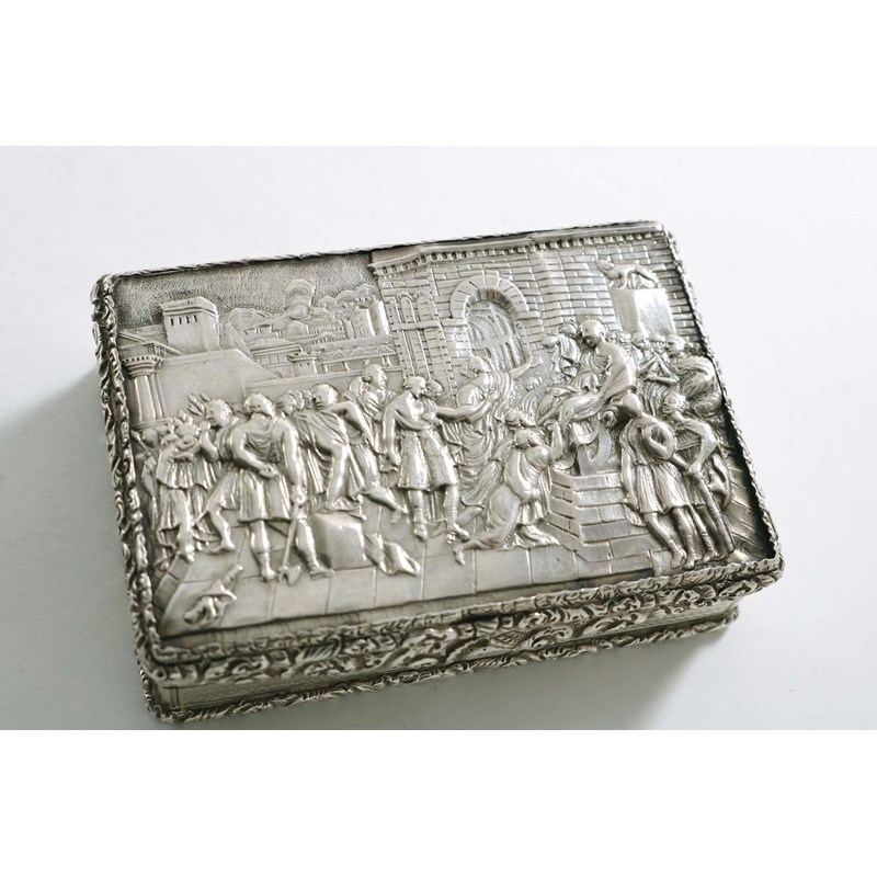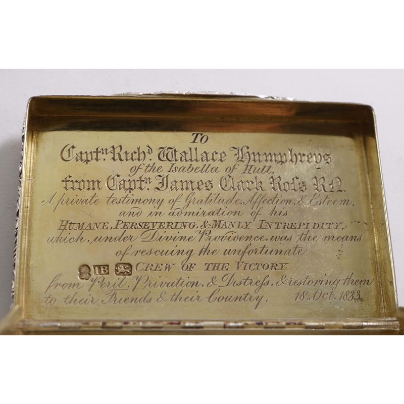 A George IV rectangular snuff box with engine-turning and raised floral borders and thumbpiece, the cover depicting a classical figural scene in ancient Rome, the gilt interior inscribed "To Capt. Richd. Wallace Humphreys of the Isabella of Hull, from Capt. James Clark Ross. RN. A private testimony of Gratitude, Affection and Esteem and in Admiration of his Humane, Persevering and Manly Intrepidity which under divine providence was the means of rescuing them to their Friends and their Country 18 Oct.1833", by John Bettridge, Birmingham 1827; 3.4" (8.5 cms) long; 5.6 oz