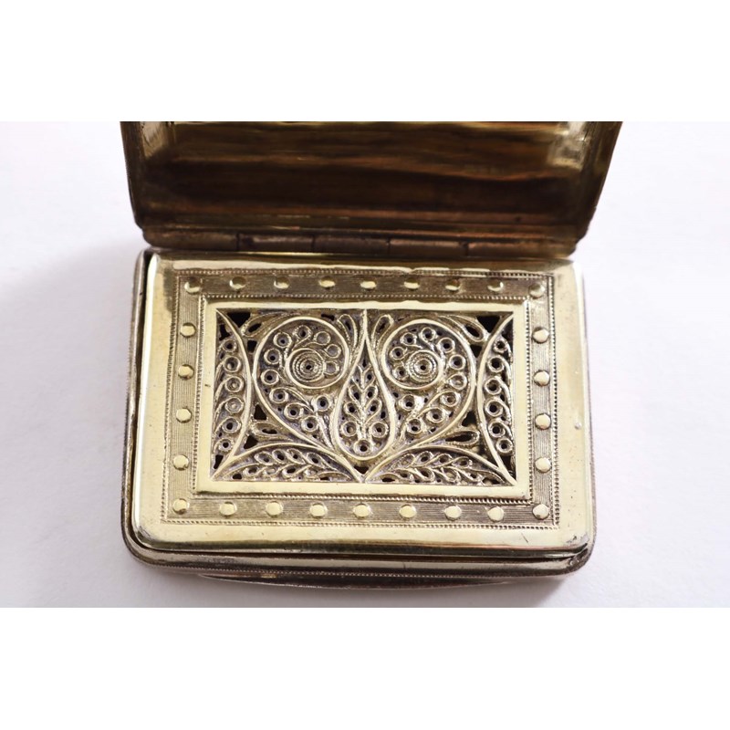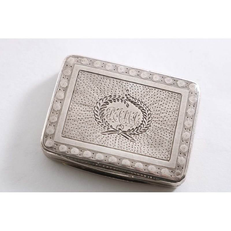 with engraved decoration, a pelleted border and a wreath cartouche, initialled, gilt interior, grille hinge A/F, by Matthew Lnwood, Birmingham 1810; 1.65" (4.2 cms) long; 0.85 oz