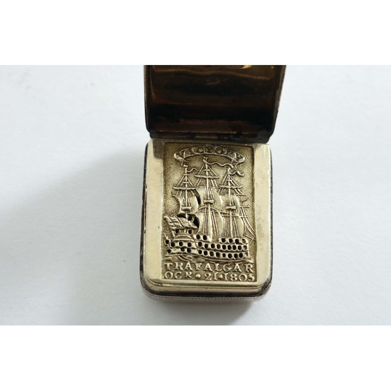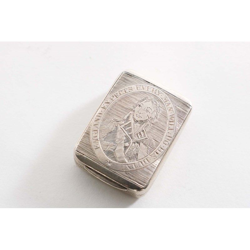 A GEORGE III "TRAFALGAR COMMEMORATIVE" SMALL RECTANGULAR VINAIGRETTE with a portrait of Viscount Horatio Nelson engraved on the cover and the legend "England Expects Every Man Will Do His Duty", gilt interior, the grille with "HMS. VICTORY and "TRAFALGAR OCTR.21.1805", by Matthew Linwood, Birmingham 1805; 1.25" (3.1 cms) long; 0.5 oz
