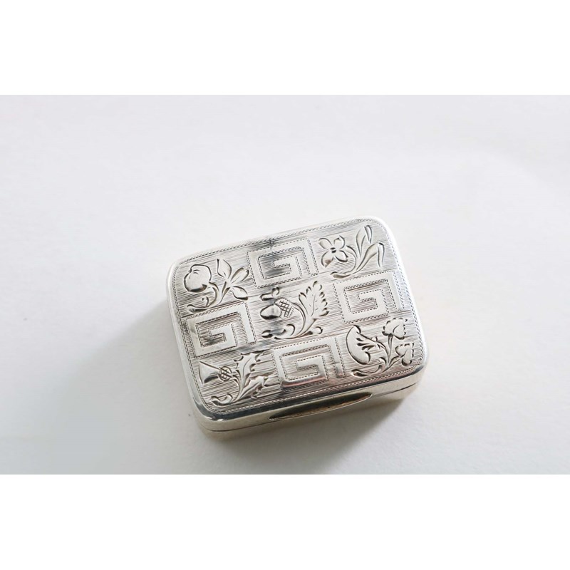 with rounded corners, engraved on the cover Greek-key motifs, various flowers and an acorn, gilt interior, by Matthew Linwood, Birmingham 1805-1810 (no date letter); 1.2" (3 cms) long; 0.5 oz