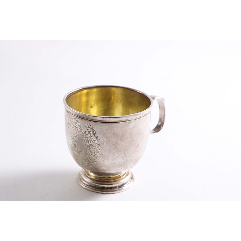 on a domed circular foot with a moulded rim and a scroll handle, engraved on the front with a scrollwork and foliate cartouche, crested, gilt interior, by William Fleming, London 1715; 2.5" (6.4 cms) high; 3 oz