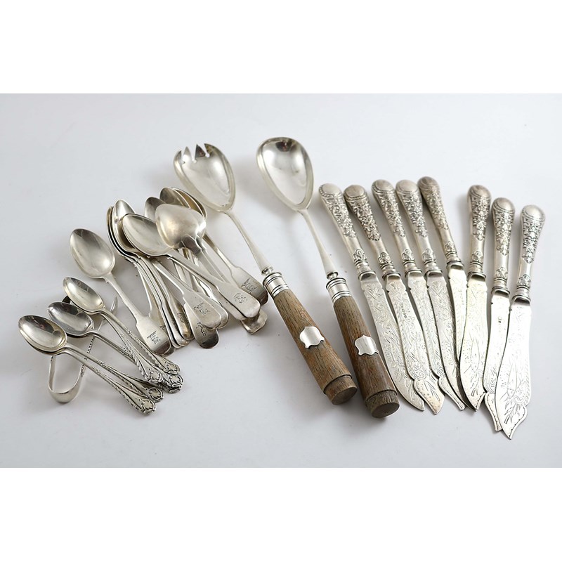 Sixteen antique Fiddle pattern tea spoons, crested, a pair of wooden handled salad servers, a set of eight Victorian fish knives (loaded handles), and a set of six late Victorian tea spoons & a pair of matching sugar tongs; 14 oz (33)