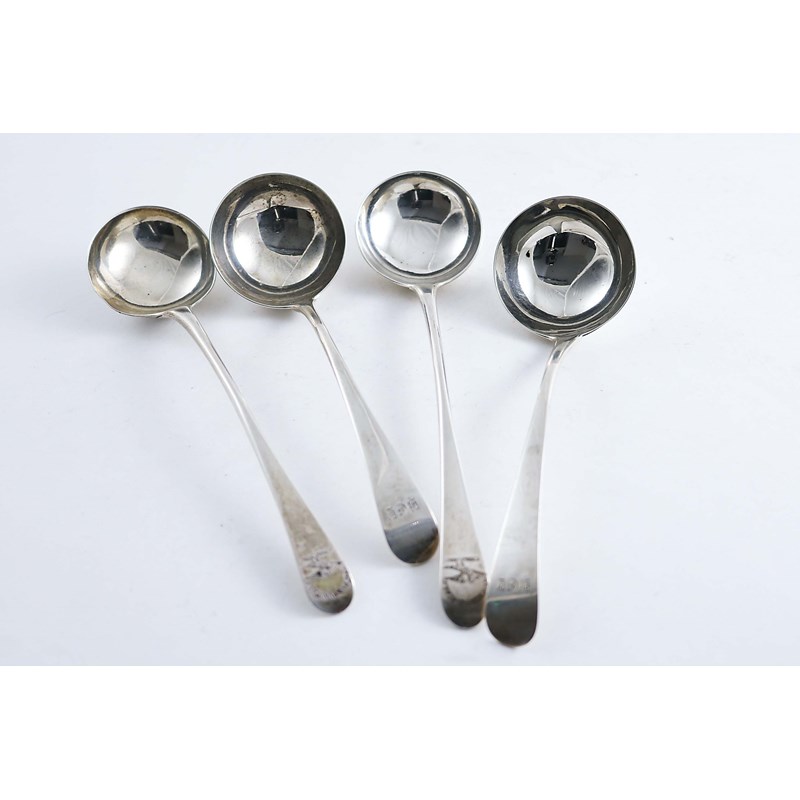 A PAIR OF GEORGE III OLD ENGLISH PATTERN SAUCE LADLES initialled, by Hester Bateman, London 1775, and a pair of Scottish sauce ladles, crested, maker's mark "Mc", Edinburgh 1781; 5.6 oz (4)