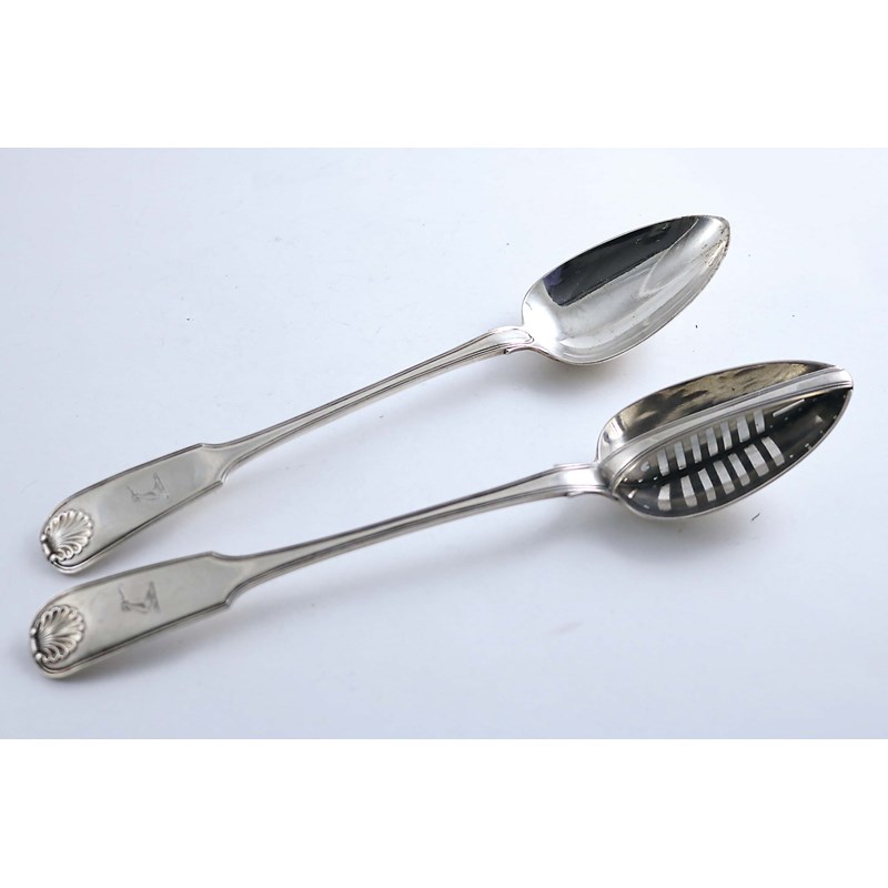 Fiddle, Thread & Shell pattern (union shell heel), and a matching strainer spoon with slotted divider, both crested to match, by S. Neville, Dublin 1818 (retailer's mark of "BROWN"); 12.4" (31.4 cms) long each; 13.1 oz (2)
