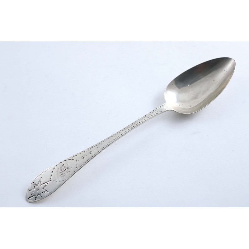 A GEORGE III IRISH PROVINCIAL BRIGHT-CUT & STAR TABLE SPOON initialled "K", by John Toleken, Cork (IT, STERLING) c.1800; 9.75" (24.7 cms) long; 2 oz